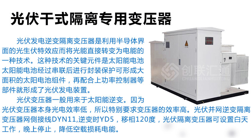 光伏并網逆變隔離變壓器網側接線dyn11,逆變時yd5,移相120度,光伏隔離變壓器可設置白天工作,晚上停止,降低空載損耗電能。